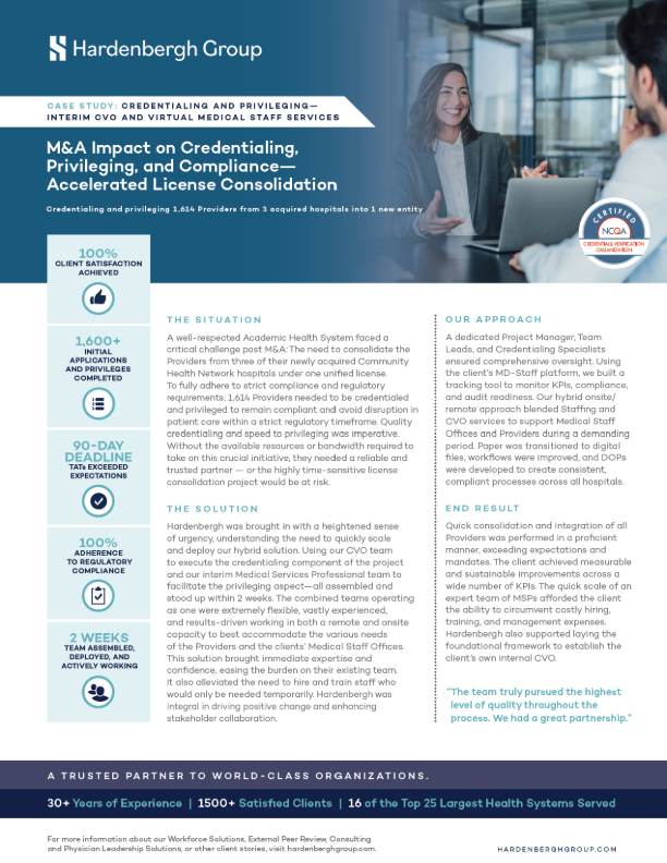 Hardenbergh was brought in with a heightened sense of urgency, understanding the need to quickly scale and deploy our hybrid solution. Using our CVO team to execute the credentialing component of the project and our interim Medical Services Professional team to facilitate the privileging aspect—all assembled and stood up within 2 weeks. The combined teams operating as one were extremely flexible, vastly experienced, and results-driven working in both a remote and onsite capacity to best accommodate the various needs of the Providers and the clients’ Medical Staff Offices. This solution brought immediate expertise and confidence, easing the burden on their existing team. It also alleviated the need to hire and train staff who would only be needed temporarily. Hardenbergh was integral in driving positive change and enhancing stakeholder collaboration.